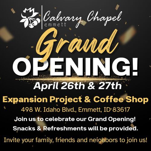 God has been doing incredible things at Calvary Chapel of Emmett, and we are excited to invite you to a very special event—the Grand Opening of our church expansion! After months of prayer, planning, and hard work, we are thrilled to open our doors and celebrate this next chapter in the life of our church family!